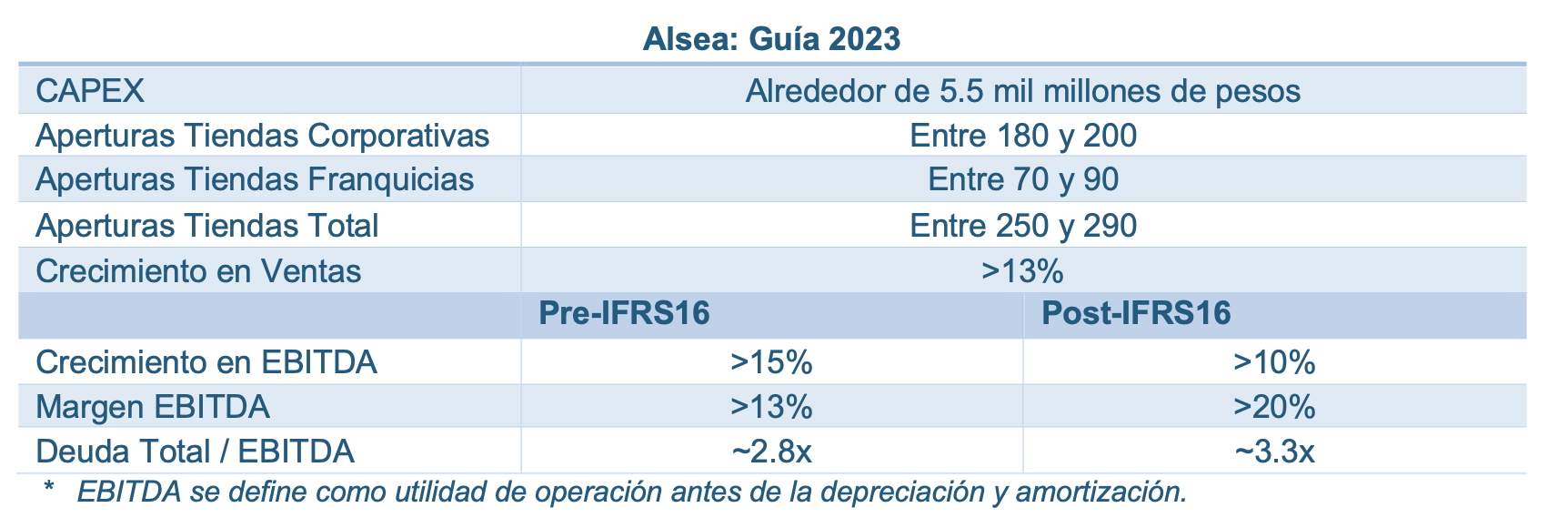 Rafael Contreras, Director de Finanzas y Administración de Alsea comentó: “En el 2023, nos enfocaremos en desarrollar nuestras marcas en los países donde tenemos presencia con el objetivo de lograr un crecimiento cercano a 13% en las ventas consolidadas, soportado por una expansión en ventas mismas tiendas de aproximadamente 17%, así como un plan de crecimiento orgánico entre 180 y 200 aperturas.