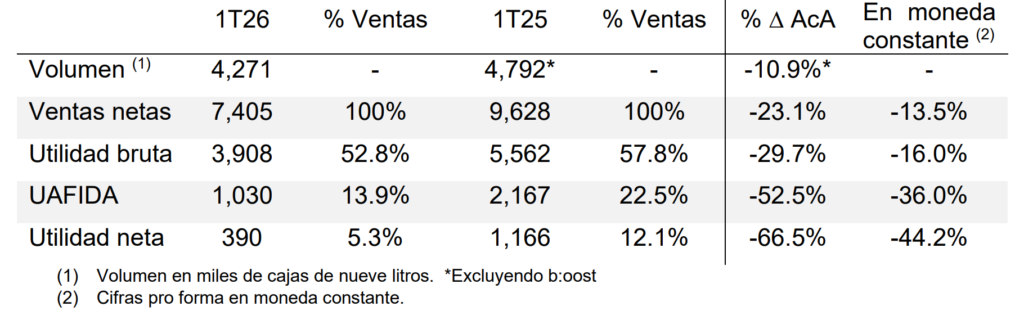 - El volumen total disminuyó 13.4%, alcanzando 4.3 millones de cajas de nueve litros, afectado por la transición de distribuidores en EE. UU. Excluyendo b:oost, el volumen disminuyó 10.9%.
