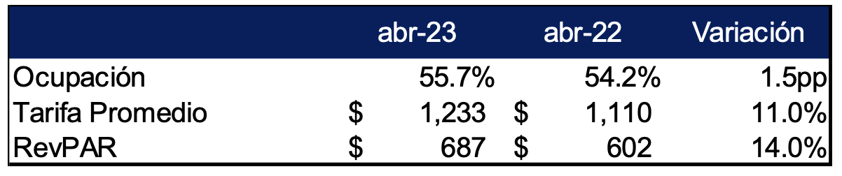 La ocupación de la cadena al mes de abril 2023 está calculada sobre una base de 152 hoteles y 17,487 habitaciones en operación. Durante el mes no hubo aperturas de hoteles. La ocupación alcanzó un nivel de 55.7%, lo cual representó un incremento de 1.5 puntos porcentuales al compararlo contra el mismo mes de 2022. La tarifa promedio tuvo un aumento de 11.0% contra el mismo mes del año anterior, con un nivel de $1,233 pesos, lo que conllevó a que el RevPAR se situara en $687 pesos, un incremento de 14.0% vs. el mismo mes de 2022.