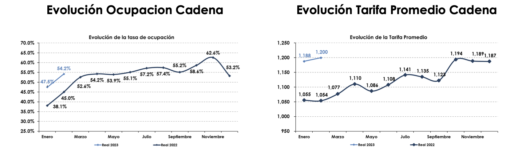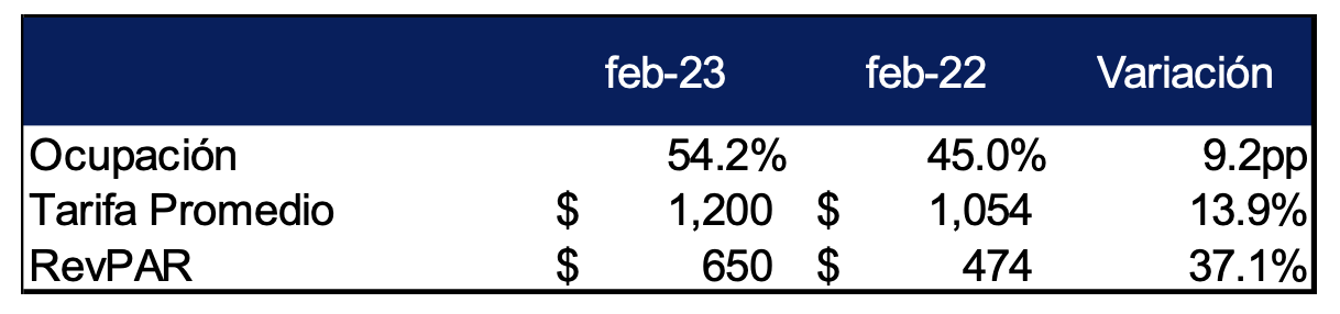 La ocupación de la cadena al mes de febrero 2023 está calculada sobre una base de 152 hoteles y 17,487 habitaciones en operación. El 1o de febrero, la Compañía inauguró dos hoteles: el hotel City Express Plus Guadalajara Providencia con 150 habitaciones y el hotel City Express Plus Mazatlán de 130 habitaciones. Asimismo, se anunció la conclusión, por acuerdo de ambas partes, del contrato de franquicia del hotel City Express Plus Satélite, el cual contaba con 89 habitaciones. La ocupación alcanzó un nivel de 54.2%, lo cual representó un incremento de 9.2 puntos porcentuales al compararlo contra el mismo mes de 2022. La tarifa promedio tuvo un aumento de 13.9% contra el mismo mes del año anterior, con un nivel de $1,200 pesos, lo que conllevó a que el RevPAR se situara en $650 pesos, un incremento de 37.1% vs. el mismo mes de 2022.