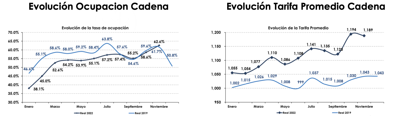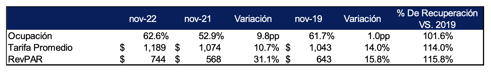 La ocupación de la cadena al mes de noviembre 2022 está calculada sobre una base de 152 hoteles y 17,356 habitaciones en operación. Durante el mes de noviembre, la Compañía no tuvo ninguna apertura de hoteles. La ocupación se ubicó en 62.6%, lo cual representó el 101.6% de recuperación vs. el mismo mes del 2019, mientras que la tarifa promedio y el RevPAR mantuvieron la tendencia al alza, con una recuperación de 114.0% y 115.8% respectivamente.