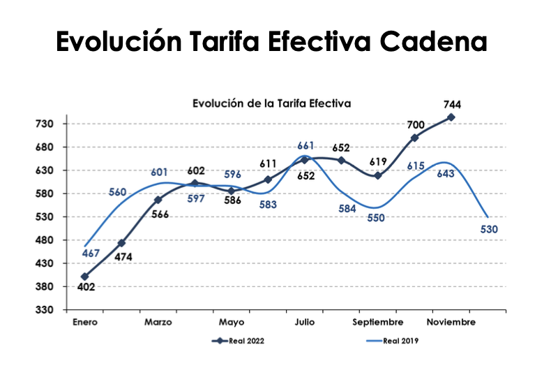 Las siguientes gráficas muestran la tendencia de recuperación en tarifas y ocupaciones con respecto al 2019, un año estable para la base de comparación. Durante el mes de noviembre, la ocupación tuvo un incremento de 9.8 puntos porcentuales año contra año, lo cual resultó en una recuperación del 101.6% al compararlo con el mismo periodo del 2019. La tarifa mostró un incremento de 10.7% año contra año y una recuperación de 114.0% contra 2019. La combinación de estos resultados situó el RevPAR en $744 pesos, 31.1% por encima del observado en el mismo mes del 2021. Lo anterior representó una recuperación del 115.8% para el RevPAR vs. 2019. Como hemos realizado a lo largo del año, seguimos aprovechando las tendencias económicas y los grandes eventos en distintos estados del país, así como capturando demanda adicional del segmento de placer.