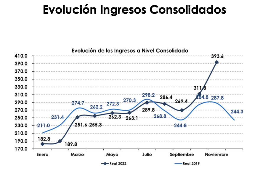 Finalmente, los ingresos a nivel consolidado para noviembre registraron un monto de $393.6 millones de pesos, lo cual representó una recuperación del 136.7% (vs. el año estable 2019).