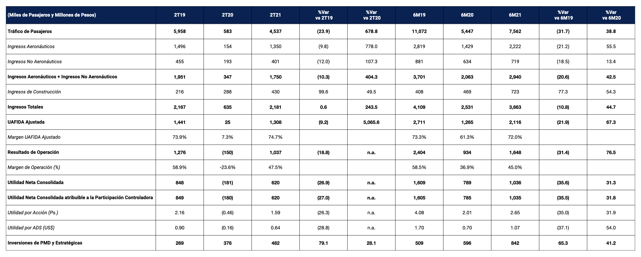 - La UAFIDA ajustada fue de Ps.1,308 millones, comparada con Ps. 25 millones en el 2T20 y fue 9.2% menor que en el 2T19.