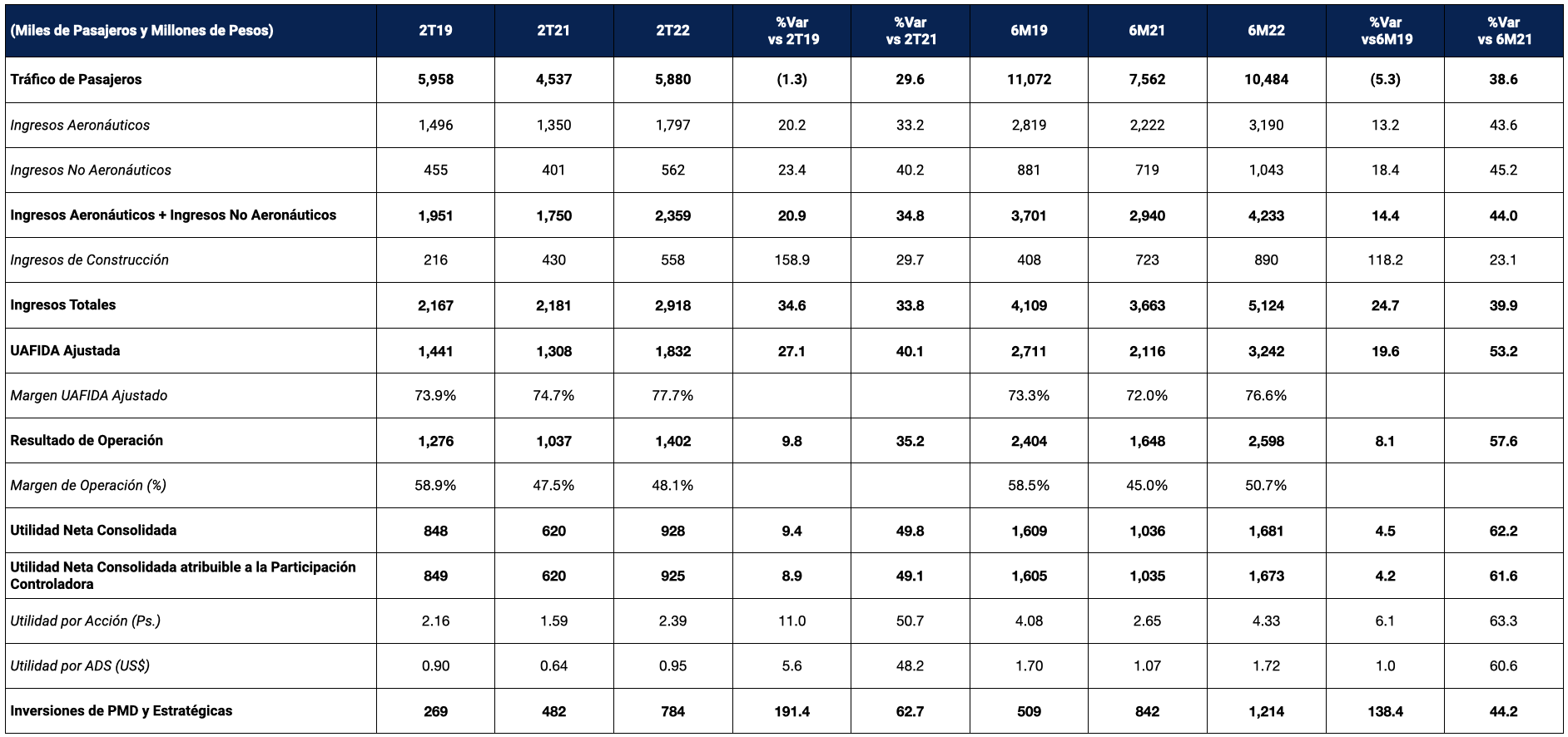 - El tráfico de pasajeros del 2T22 aumentó 29.6% comparado con el 2T21, totalizando 5.9 millones de pasajeros y fue 1.3% menor al tráfico registrado en el 2T19. Los aeropuertos con el mayor crecimiento en tráfico respecto del 2T21 fueron Monterrey, Ciudad Juárez, Chihuahua, Culiacán y Mazatlán.