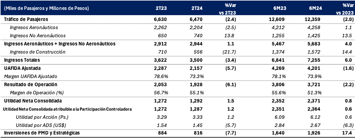 - El tráfico de pasajeros del 2T24 disminuyó 2.4% comparado con el 2T23, totalizando 6.5 millones de pasajeros.