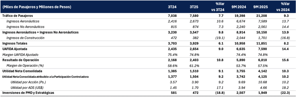 - La suma de ingresos aeronáuticos y no aeronáuticos creció 9.8% comparado con el 3T24.