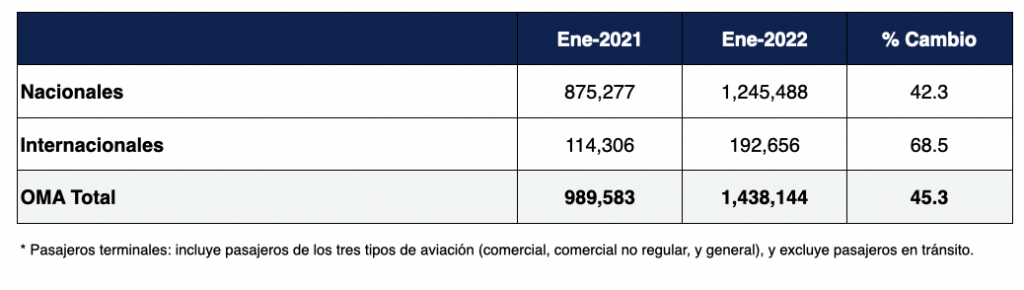 Ciudad de México, México, 4 de febrero de 2022.- Grupo Aeroportuario del Centro Norte, S.A.B. de C.V. (BMV: OMA; NASDAQ: OMAB), informa que el número de pasajeros totales (pasajeros terminales) transportados en sus 13 aeropuertos durante el mes de enero de 2022 creció 45.3% con respecto a lo registrado en el mismo periodo de 2021. El tráfico de pasajeros nacionales incrementó 42.3% y el de pasajeros internacionales aumentó 68.5%.