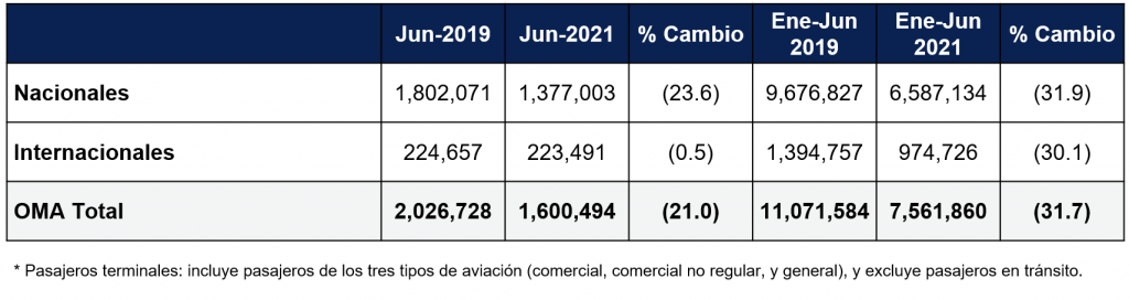 El número de pasajeros totales disminuyó 21.0% con respecto a lo registrado en el mismo periodo de 2019. El tráfico de pasajeros nacionales decreció 23.6% y el de pasajeros internacionales decreció 0.5%.