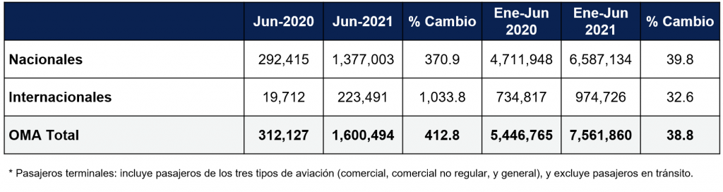 Ciudad de México, México, 5 de julio de 2021.- Grupo Aeroportuario del Centro Norte, S.A.B. de C.V. (BMV: OMA; NASDAQ: OMAB), informa que el número de pasajeros totales (pasajeros terminales) transportados en sus 13 aeropuertos durante el mes de junio de 2021 creció 412.8% con respecto a lo registrado en el mismo periodo de 2020. El tráfico de pasajeros nacionales incrementó 370.9% y el de pasajeros internacionales aumentó 1,033.8%. Es importante mencionar que la base de comparación del mes de junio de 2020 continuaba afectada por la restricción de actividades en el país.