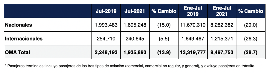 El número de pasajeros totales disminuyó 13.9% con respecto a lo registrado en el mismo periodo de 2019. El tráfico de pasajeros nacionales decreció 15.0% y el de pasajeros internacionales decreció 5.5%.