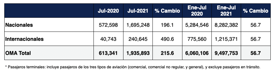 Ciudad de México, México, 4 de agosto de 2021.- Grupo Aeroportuario del Centro Norte, S.A.B. de C.V. (BMV: OMA; NASDAQ: OMAB), informa que el número de pasajeros totales (pasajeros terminales) transportados en sus 13 aeropuertos durante el mes de julio de 2021 creció 215.6% con respecto a lo registrado en el mismo periodo de 2020. El tráfico de pasajeros nacionales incrementó 196.1% y el de pasajeros internacionales aumentó 490.6%. Es importante mencionar que la base de comparación del mes de julio de 2020 continuaba afectada por la restricción de actividades en el país.