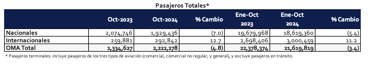 Ciudad de México, México, 7 de noviembre de 2024.- Grupo Aeroportuario del Centro Norte, S.A.B. de C.V. (BMV: OMA; NASDAQ: OMAB), informa que el número de pasajeros totales (pasajeros terminales) transportados en sus 13 aeropuertos durante el mes de octubre de 2024 disminuyó 4.8% con respecto a lo registrado en el mismo periodo de 2023. El tráfico de pasajeros nacionales disminuyó 7.0% y el de pasajeros internacionales aumentó 12.7%.