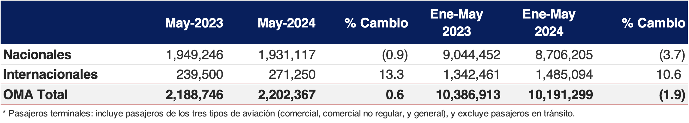 Ciudad de México, México, 6 de junio de 2024.- Grupo Aeroportuario del Centro Norte, S.A.B. de C.V. (BMV: OMA; NASDAQ: OMAB), informa que el número de pasajeros totales (pasajeros terminales) transportados en sus 13 aeropuertos durante el mes de mayo de 2024 incrementó 0.6% con respecto a lo registrado en el mismo periodo de 2023. El tráfico de pasajeros nacionales disminuyó 0.9% y el de pasajeros internacionales aumentó 13.3%. Durante mayo, las cifras del Aeropuerto de Acapulco, que operó de manera normalizada, reflejan el impacto del huracán Otis en el destino. Excluyendo el aeropuerto de Acapulco, los pasajeros terminales en los 12 aeropuertos restantes operados por OMA registraron un incremento de 1.6% en el mes de mayo.