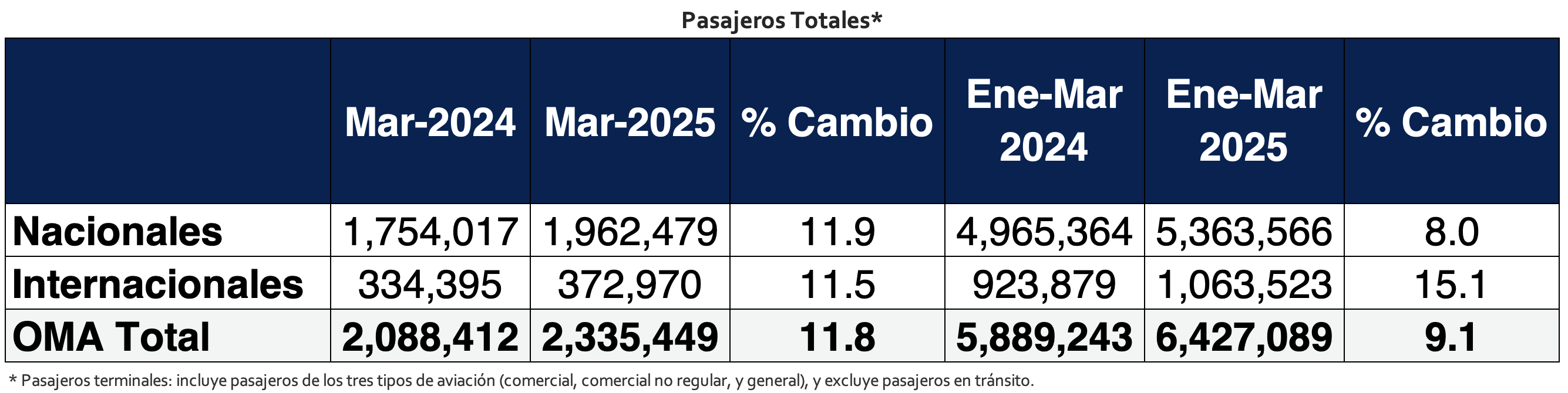 Ciudad de México, México, 7 de abril de 2025.- Grupo Aeroportuario del Centro Norte, S.A.B. de C.V. (BMV: OMA; NASDAQ: OMAB), informa que el número de pasajeros totales (pasajeros terminales) transportados en sus 13 aeropuertos durante el mes de marzo de 2025 creció 11.8% con respecto a lo registrado en el mismo periodo de 2024. El tráfico de pasajeros nacionales se incrementó 11.9% y el de pasajeros internacionales creció 11.5%.