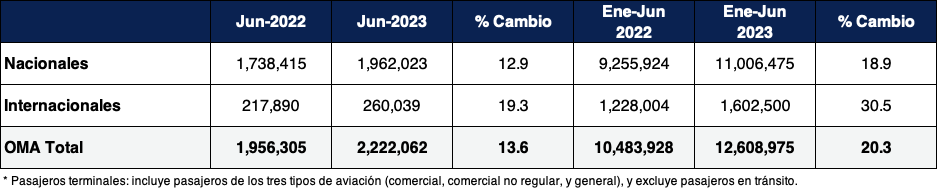 Ciudad de México, México, 5 de julio de 2023.- Grupo Aeroportuario del Centro Norte, S.A.B. de C.V. (BMV: OMA; NASDAQ: OMAB), informa que el número de pasajeros totales (pasajeros terminales) transportados en sus 13 aeropuertos durante el mes de junio de 2023 creció 13.6% con respecto a lo registrado en el mismo periodo de 2022. El tráfico de pasajeros nacionales incrementó 12.9% y el de pasajeros internacionales aumentó 19.3%.
