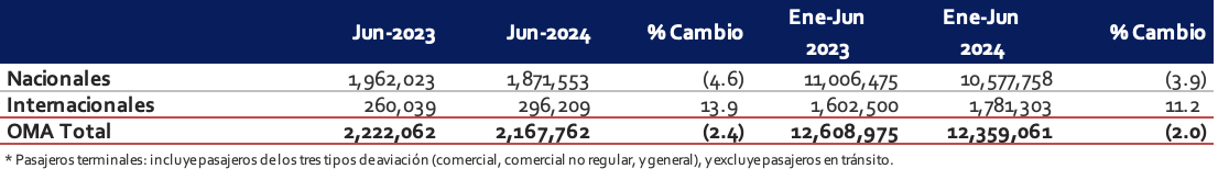 Ciudad de México, México, 5 de julio de 2024.- Grupo Aeroportuario del Centro Norte, S.A.B. de C.V. (BMV: OMA; NASDAQ: OMAB), informa que el número de pasajeros totales (pasajeros terminales) transportados en sus 13 aeropuertos durante el mes de junio de 2024 disminuyó 2.4% con respecto a lo registrado en el mismo periodo de 2023. El tráfico de pasajeros nacionales disminuyó 4.6% y el de pasajeros internacionales aumentó 13.9%. Durante junio, las cifras del Aeropuerto de Acapulco, que operó de manera normalizada, reflejan el impacto del huracán Otis en el destino. Excluyendo el aeropuerto de Acapulco, los pasajeros terminales en los 12 aeropuertos restantes operados por OMA registraron una disminución de 1.3% en el mes de junio.