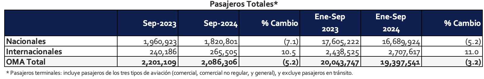 Ciudad de México, México, 7 de octubre de 2024.- Grupo Aeroportuario del Centro Norte, S.A.B. de C.V. (BMV: OMA; NASDAQ: OMAB), informa que el número de pasajeros totales (pasajeros terminales) transportados en sus 13 aeropuertos durante el mes de septiembre de 2024 disminuyó 5.2% con respecto a lo registrado en el mismo periodo de 2023. El tráfico de pasajeros nacionales disminuyó 7.1% y el de pasajeros internacionales aumentó 10.5%. Excluyendo el aeropuerto de Acapulco, cuyo destino refleja el impacto del huracán Otis en el destino, los pasajeros terminales en los 12 aeropuertos restantes operados por OMA registraron una disminución de 3.6% en el mes de septiembre.