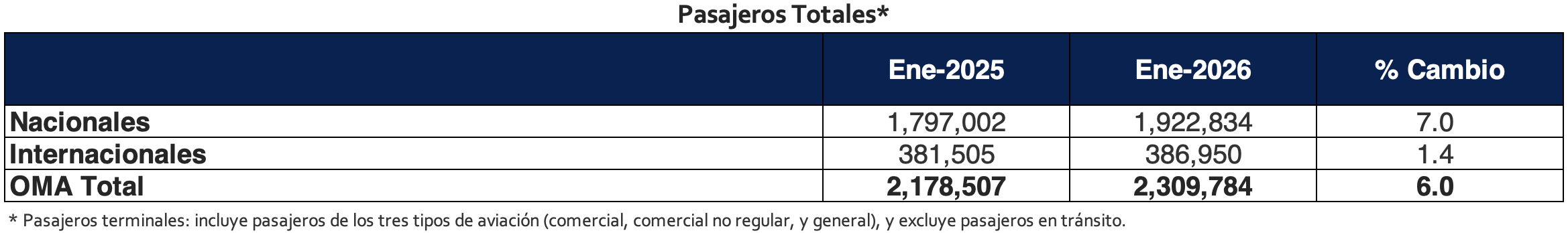 Ciudad de México, México, 5 de febrero de 2026.- Grupo Aeroportuario del Centro Norte, S.A.B. de C.V. (BMV: OMA; NASDAQ: OMAB), informa que el número de pasajeros totales (pasajeros terminales) transportados en sus 13 aeropuertos durante el mes de enero de 2026 creció 6.0% con respecto a lo registrado en el mismo periodo de 2025. El tráfico de pasajeros nacionales se incrementó 7.0% y el de pasajeros internacionales aumentó 1.4%.
