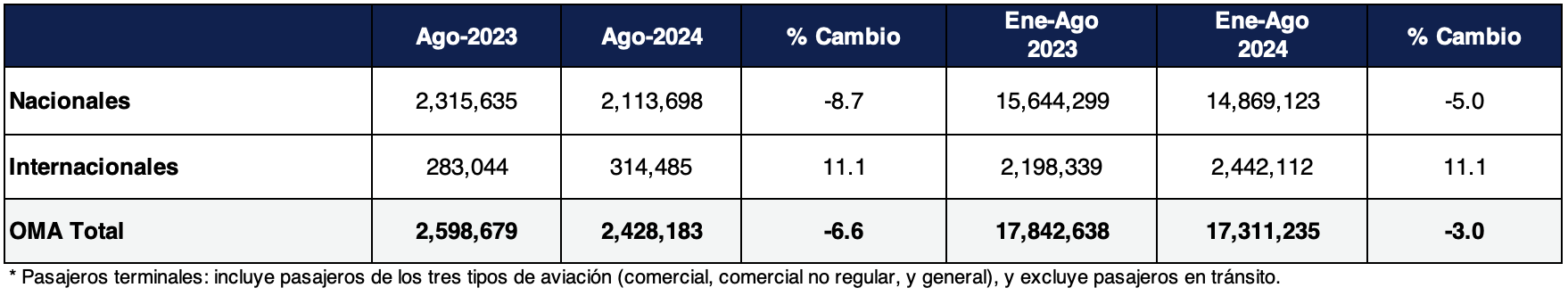 Ciudad de México, México, 6 de septiembre de 2024.- Grupo Aeroportuario del Centro Norte, S.A.B. de C.V. (BMV: OMA; NASDAQ: OMAB), informa que el número de pasajeros totales (pasajeros terminales) transportados en sus 13 aeropuertos durante el mes de agosto de 2024 disminuyó 6.6% con respecto a lo registrado en el mismo periodo de 2023. El tráfico de pasajeros nacionales disminuyó 8.7% y el de pasajeros internacionales aumentó 11.1%. Excluyendo el aeropuerto de Acapulco, cuyo destino refleja el impacto del huracán Otis en el destino, los pasajeros terminales en los 12 aeropuertos restantes operados por OMA registraron una disminución de 5.2% en el mes de agosto.