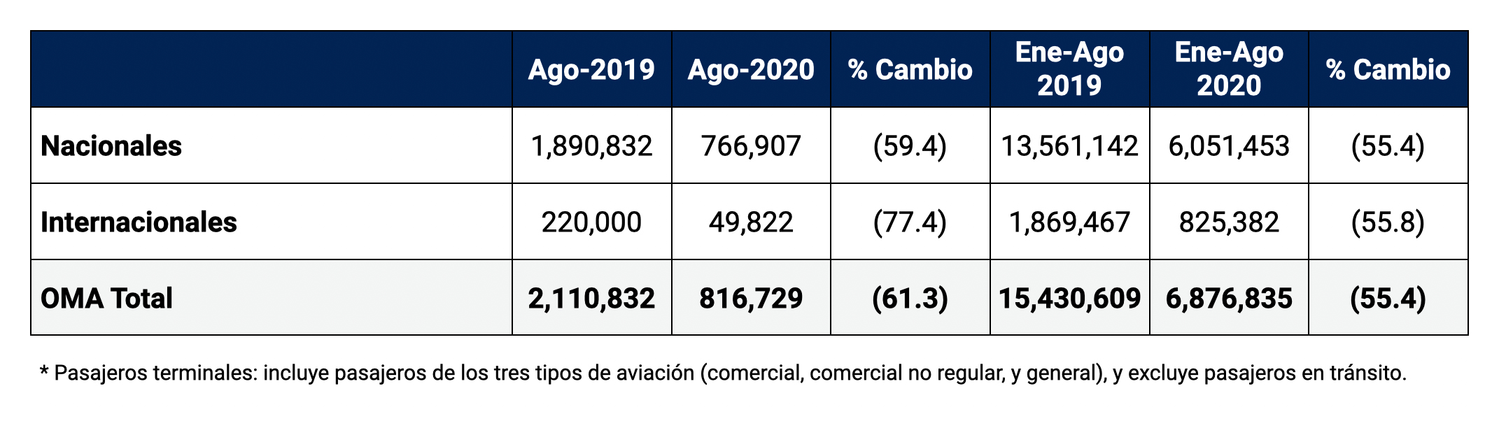 Ciudad de México, México, 4 de septiembre de 2020.- Grupo Aeroportuario del Centro Norte, S.A.B. de C.V. (BMV: OMA; NASDAQ: OMAB), informa que el número de pasajeros totales (pasajeros terminales) transportados en sus 13 aeropuertos durante el mes de agosto de 2020 disminuyó 61.3% con respecto a lo registrado en el mismo periodo de 2019. El tráfico de pasajeros nacionales decreció 59.4% y el de pasajeros internacionales disminuyó 77.4%.