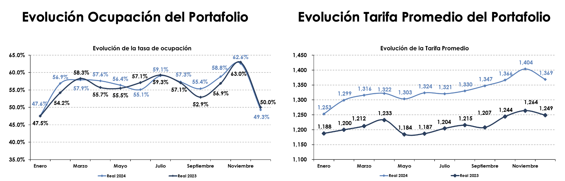 La ocupación del portafolio fue de 49.3%, lo cual representó una disminución de 0.7 puntos porcentuales con respecto al mismo mes de 2023. Por otro lado, la tarifa promedio tuvo un aumento de 9.6% contra el mismo mes del 2023, registrando un monto de $1,369 pesos. Para el mes de diciembre, el RevPAR alcanzó un nivel de $675 pesos, lo que representó un aumento del 8.0% contra el mismo mes del 2023.