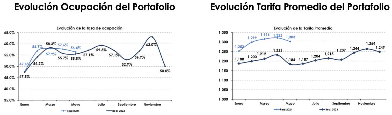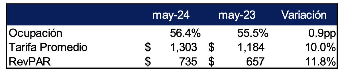 La ocupación del portafolio fue de 56.4%, lo cual representó un incremento de 0.9 puntos porcentuales con respecto al mismo mes de 2023. Por otro lado, la tarifa promedio tuvo un aumento de 10.0% contra el mismo mes de 2023, registrando un monto de $1,303 pesos. Para el mes de mayo, el RevPAR alcanzó un nivel de $735 pesos, lo que representó un aumento de 11.8% vs. el mismo mes del 2023.