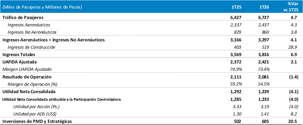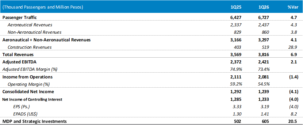 - Passenger traffic increased 4.7% during 1Q26, as compared to 1Q25, reaching 6.7 million passengers. The airports with the highest traffic growth compared to 1Q25 were Monterrey, San Luis Potosí, Durango, Chihuahua and Zihuatanejo.