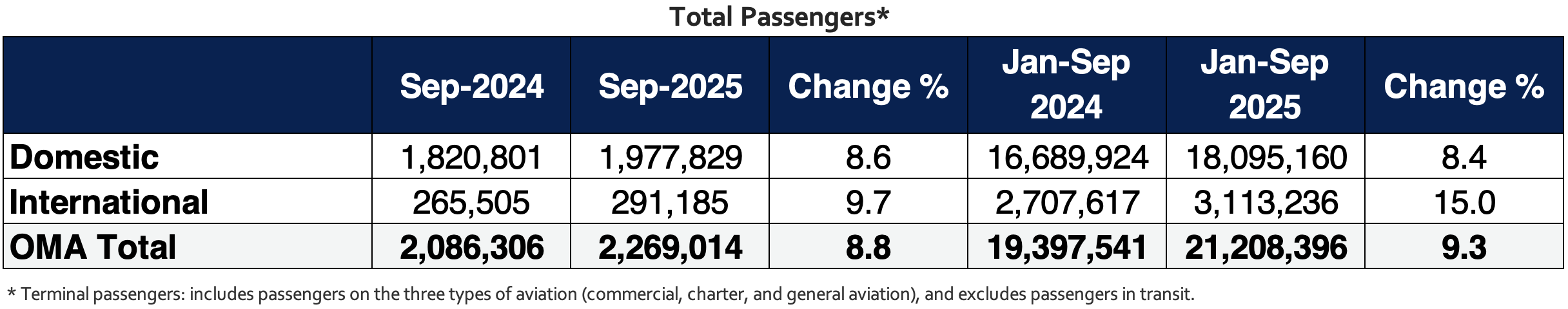 Mexico City, Mexico, October 6, 2025 — Mexican airport operator Grupo Aeroportuario del Centro Norte, S.A.B. de C.V., known as OMA (NASDAQ: OMAB; BMV: OMA), reports that terminal passenger traffic at its 13 airports increased 8.8% in September 2025, as compared to September 2024. Domestic traffic increased 8.6%, and international traffic increased 9.7%.