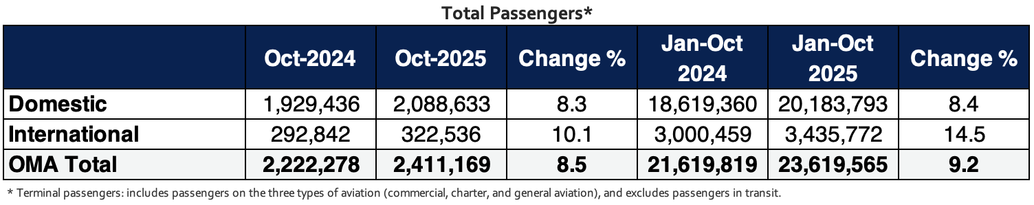 Mexico City, Mexico, November 4, 2025 — Mexican airport operator Grupo Aeroportuario del Centro Norte, S.A.B. de C.V., known as OMA (NASDAQ: OMAB; BMV: OMA), reports that terminal passenger traffic at its 13 airports increased 8.5% in October 2025, as compared to October 2024. Domestic traffic increased 8.3%, and international traffic increased 10.1%.